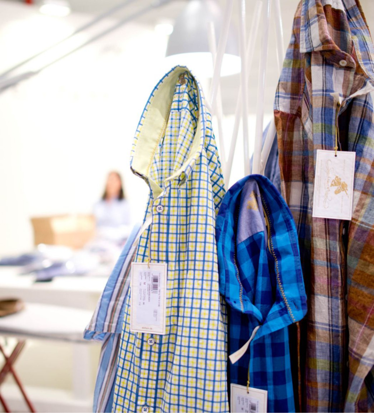Der Style ist als Grundfarbe weiss sein, damit die Hemden und Blusen gut zur Geltung kommen, eine Atelieratmosphäre, jung, kreativ und handwerklich. Der Tisch war deshalb ein großer Ateliertisch, eine Pinnwand als Mute-Board, eine übergroße Arbeitsplatzleuchte und offene Regale schaffen eine echte Arbeitsatmosphäre. Die Einführungskampagne als Banner am Rand. Eine Ankündigung für die kommenden POS-Aktionen.