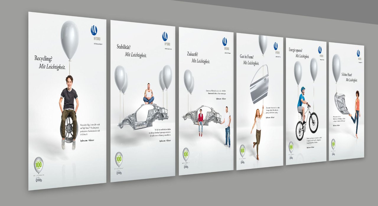 Der Ansatz ziehlt auf die Nachhaltigkeit der neuen Anlage für Automotive-Aluminium-Teile. Aluminium ist sehr leicht und spart so viel Gewicht, macht Autos leichter und ist recyclebar – damit wird die Energiebilanz besser. Das haben wir unter dem Motto „Mit Leichtigkeit“ zusammengefasst und eine Kampagne mit vielen Motiven entworfen. Umgesetzt mit einer Kombination aus klassischen Fotoshootings und 3D-Renderings.