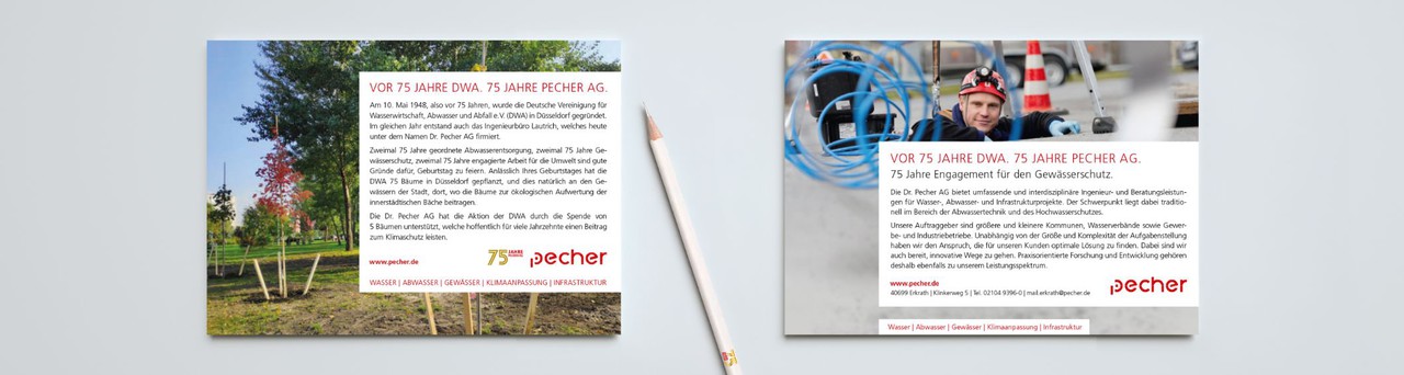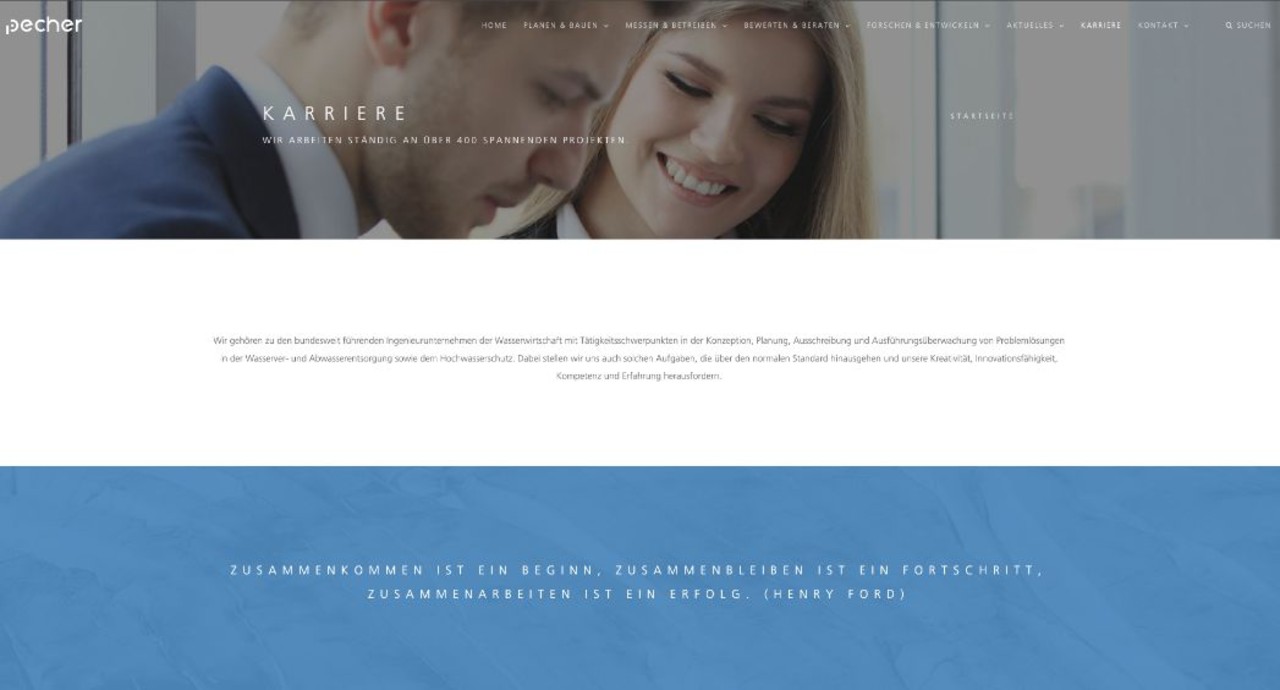Die Webseiten für die Pecher AG sowie Pecher Technik und Pecher Software sind Seiten mit viel Content und viel Information. Daher haben wir diese Seiten eher redaktionell aufgebaut – wie eine gut designte Datenbank. Die Seiten haben viele News, Stellenanzeigen und viel Information zum Thema Starkregen, Gewässerschutz und Abwasserentsorgung. Zu den Bereichen und Produkten gibt es Datenblätter sowie Anzeigen zur Produktkommunikation und Imagebildung.