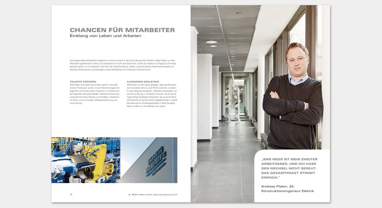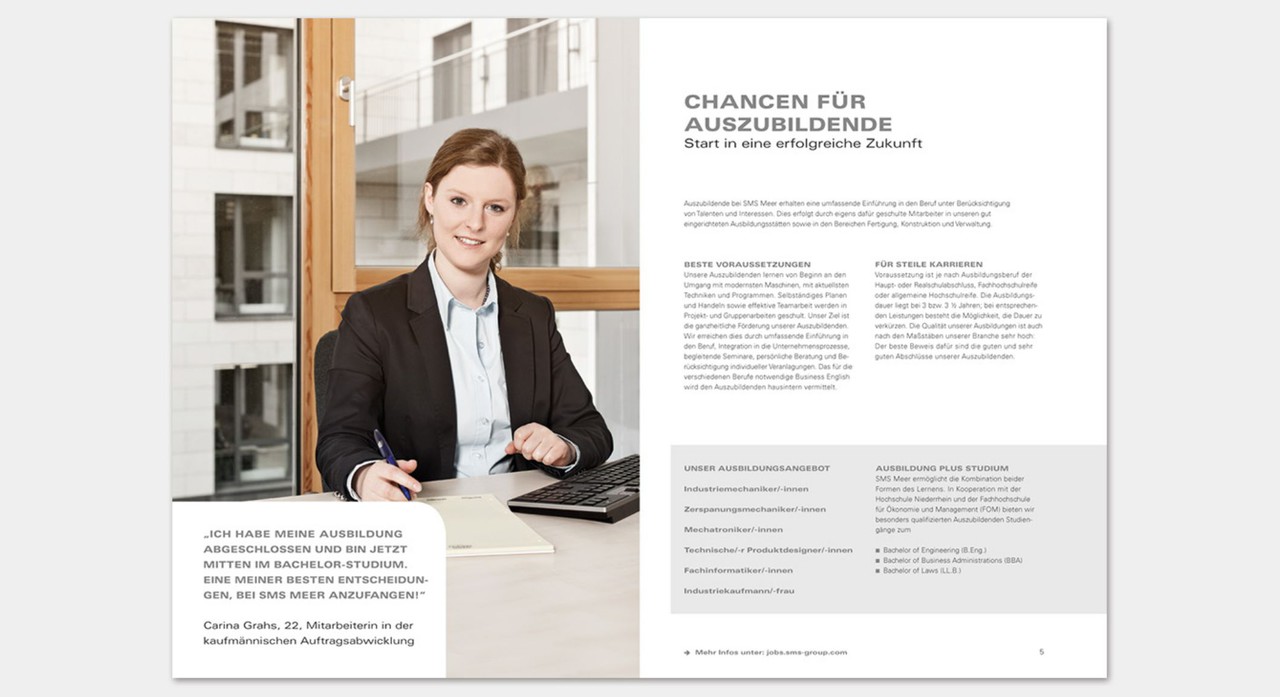 Ein weiterer Schwerpunkt war die Einführung der Nachhaltigkeitsmarke ECOPLANTS. Bei der Mitarbeitersuche haben wir SMS Meer mit einer Testimonial-Kampagne- und Broschüre begleitet – vom Fotoshooting bis zum Druck. Ebenso haben wir SMS Meer beim Recruiting der Auszubildenden unterstützt und die vielseitigen Berufsbilder im Konzern mit einem coolen Rollenbuch vorgestellt.